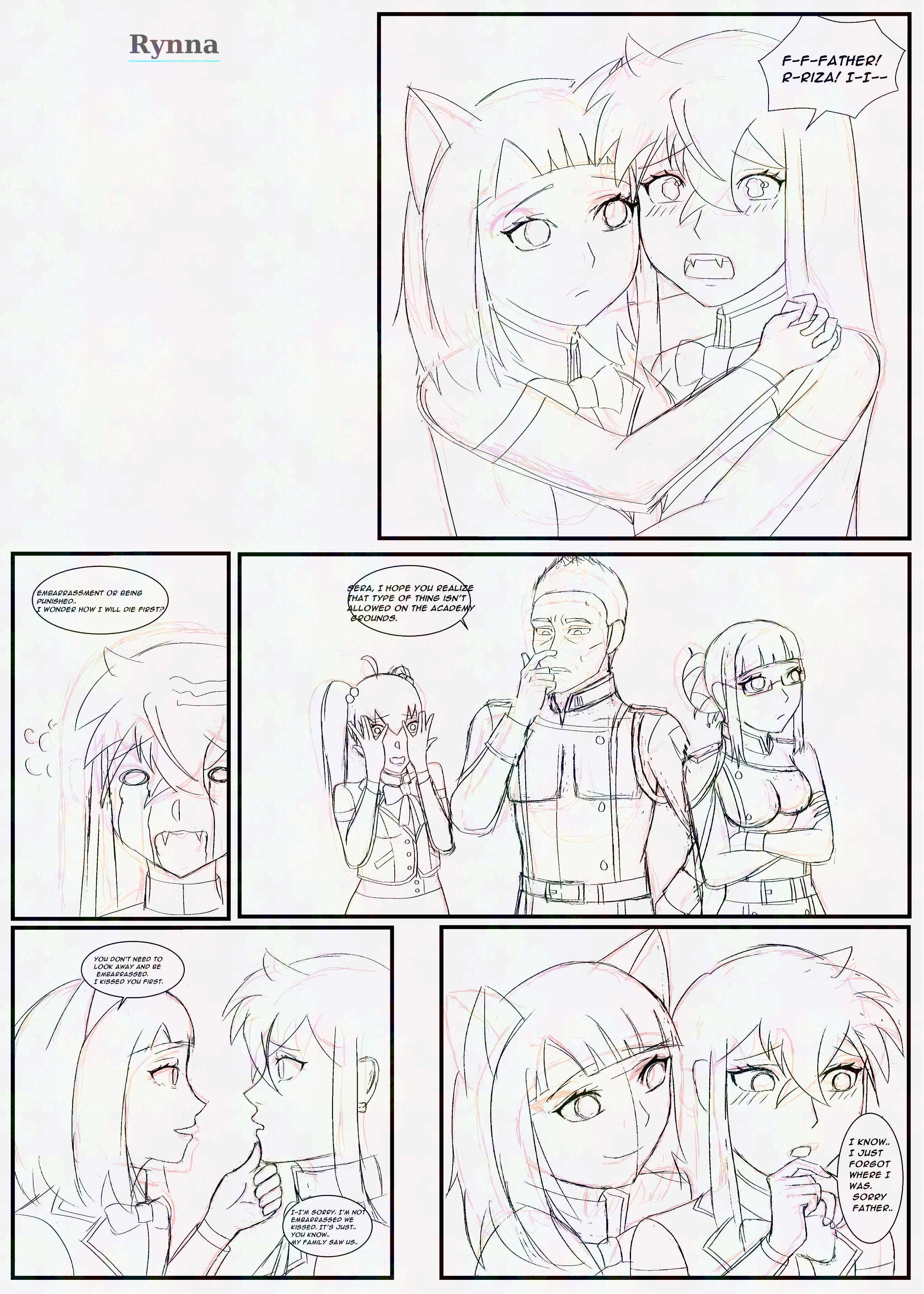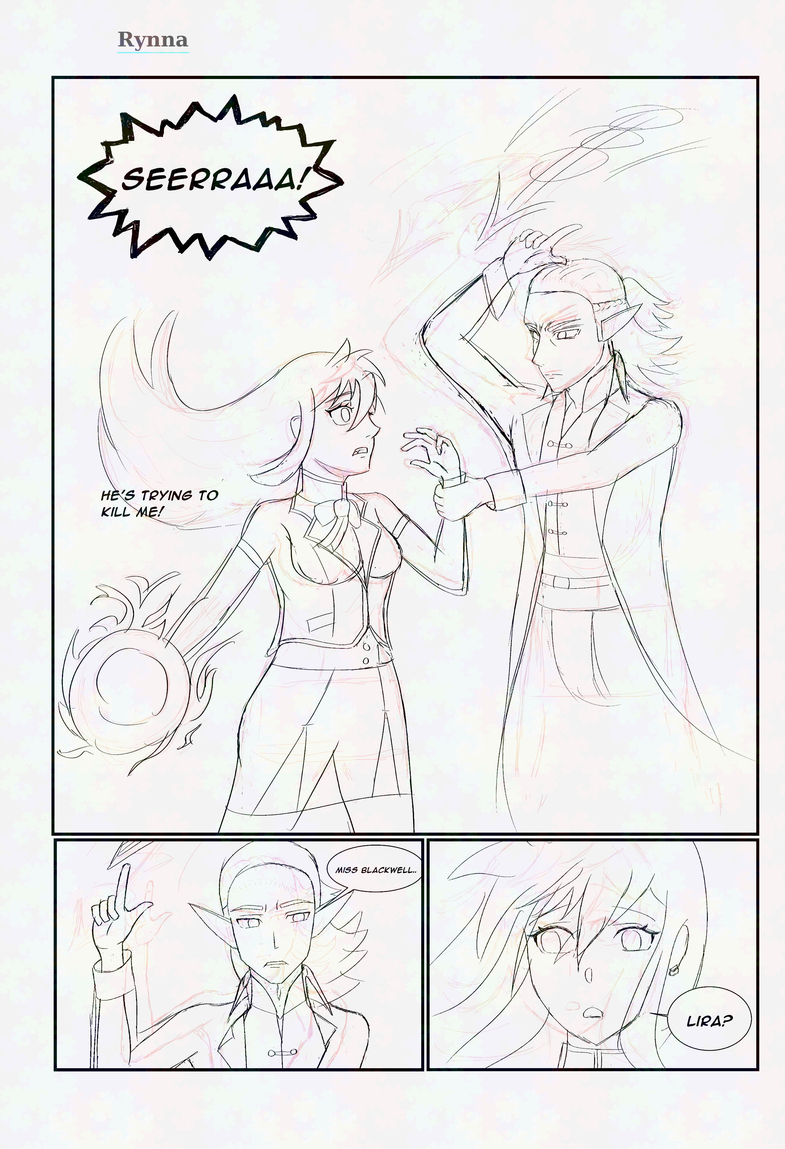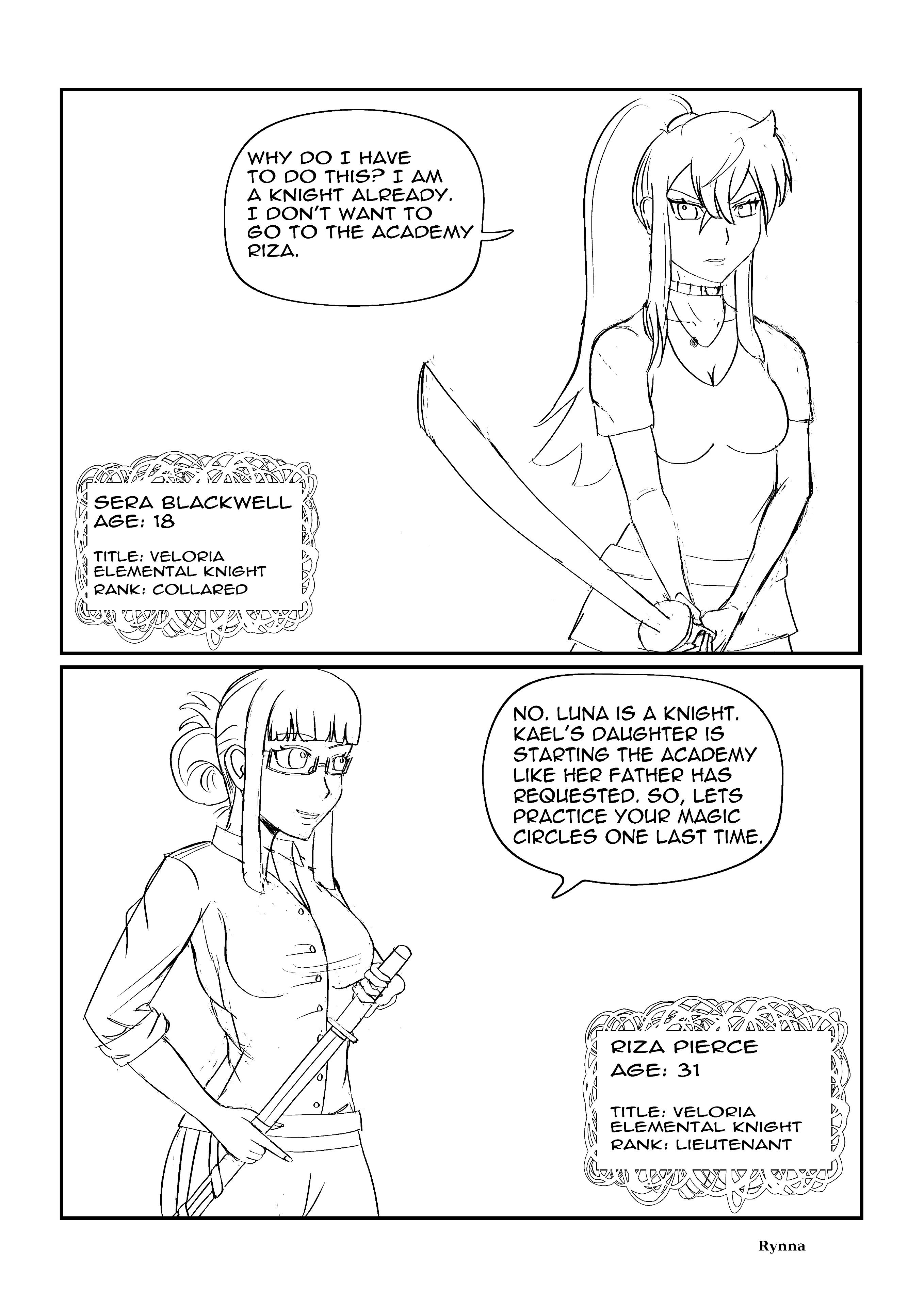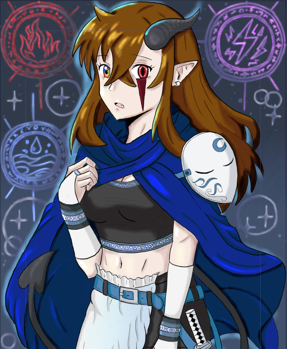 Rynna, known as Sera Blackwell, is the half-devil daughter of the devil Ignir and a prism-eyed human. She was adopted by a human knight named Kael Blackwell. Kael was sent on a mission with Riza and a few other soldeirs to kill a monster that was killing people and destroying territory in the area of the Veloria region. When he arrived, he discovered a little girl was the culprit and couldn't kill her. He discovered she was just trying to survive and was passive when left alone, so he brought her home instead. King Aldric (King of Veloria) saw Rynna and wanted her killed immediately, but Kael pleaded to spare her, and convinced Aldric she could be of value to the kingdom since she was a devil and had a prism eye. Kael suggested that he could train the girl and she could make the kingdom stronger and Aldric so the value and agreed. Aldric demanded Kael train the girl and do anything he needed her to do and eventually be given to him when she was older.Rynna grew up secluded, trained by Riza, and raised to control her magic through magic circles—despite being unable to properly use them. Rynna lives a side life where she works as an elemental knight with her father Kael and Riza under the guise of Luna under the order of King Aldric. From the age of around nine, Rynna began going out and doing missions with Kael and Riza. With time, she developed a repuation and advanced her rank until other nations took notice of her and wanted to kill her before she got any sttonger, so she was added into the black book (a book of high target figures). When Kael finds out that Rynna is being targeted, he doesn't tell Rynna and removes her from missions and enrolls her into the Veloria Magic Academy so she wouldn't be in danger. Now she lives a double life as a student enrolled at the academy, and a magic knight for the kingdom.✦ Relationships