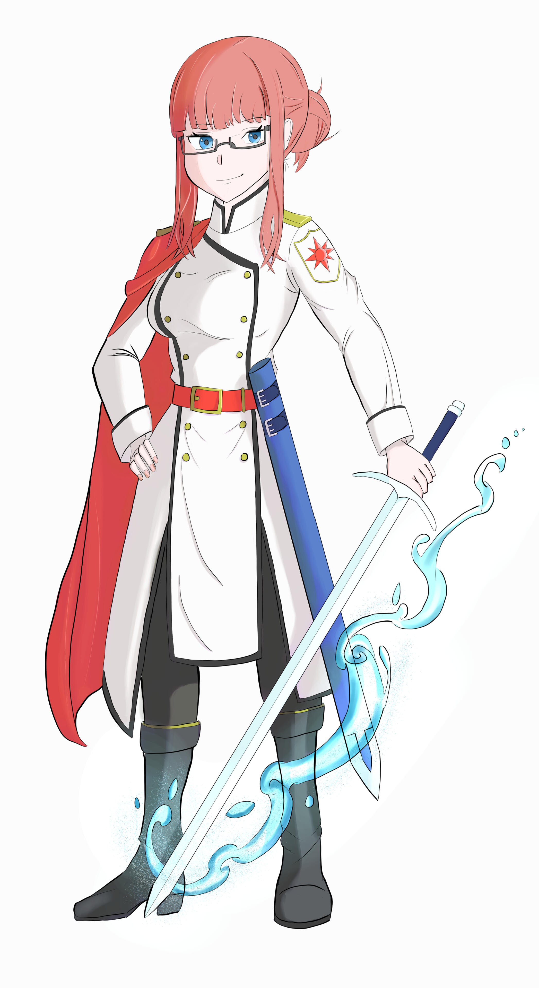 - Clothing Style: White military uniform with red cape of Veloria, practical boots, blue-glowing sword with water runes