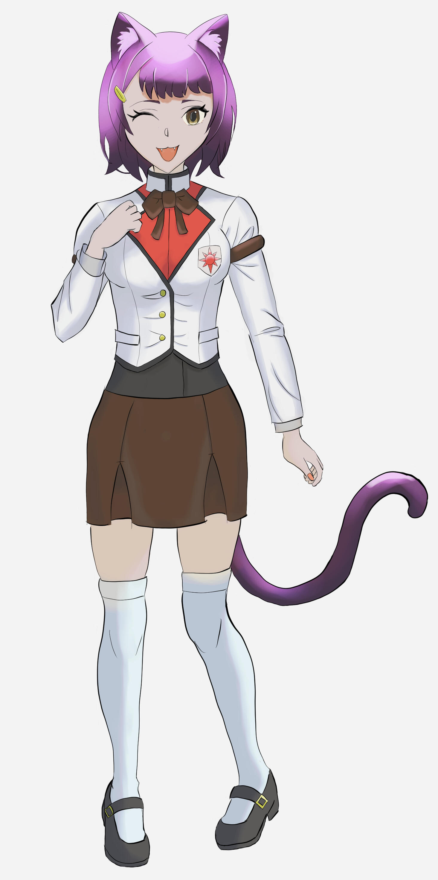 Notable Features: Soft feline ears, expressive golden eyes, short purple hair, playful tail that reflects her mood